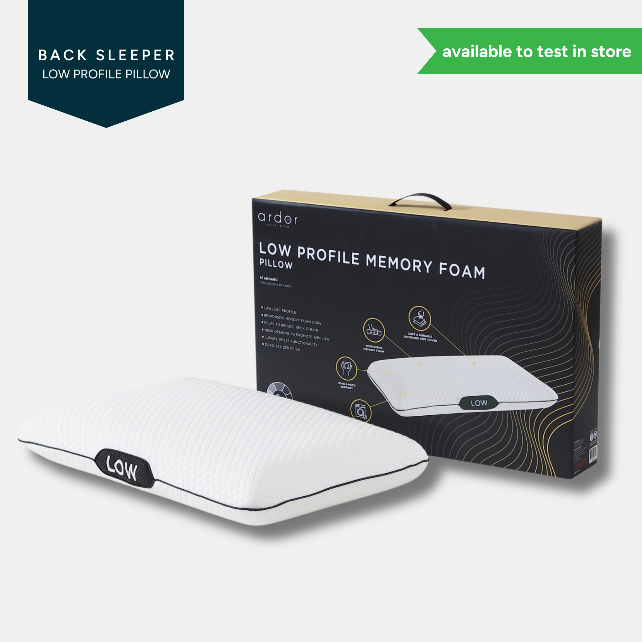 Available to try in-store at Sleepdoctor Griffith so you can compare pillow heights side by side.